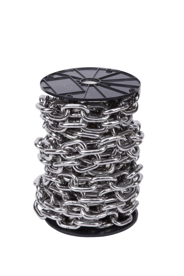 Las cadenas en acero inoxidable disponibles en bobina. Se aplican en trabajos de bricolaje, pequeños usos industriales, ganaderos, pesca, agricultura. Eslabón de 8 milímetros de diámetro y 16 metros.