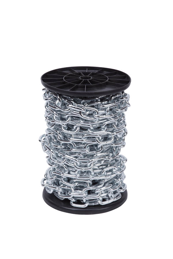 Las cadenas de hierro cincado disponibles en bobina. Se aplican en trabajos de señalización, zonas deportivas y recreativas. Eslabón de 4 milímetros de diámetro y 72 metros.