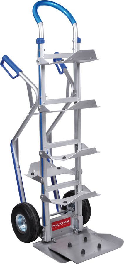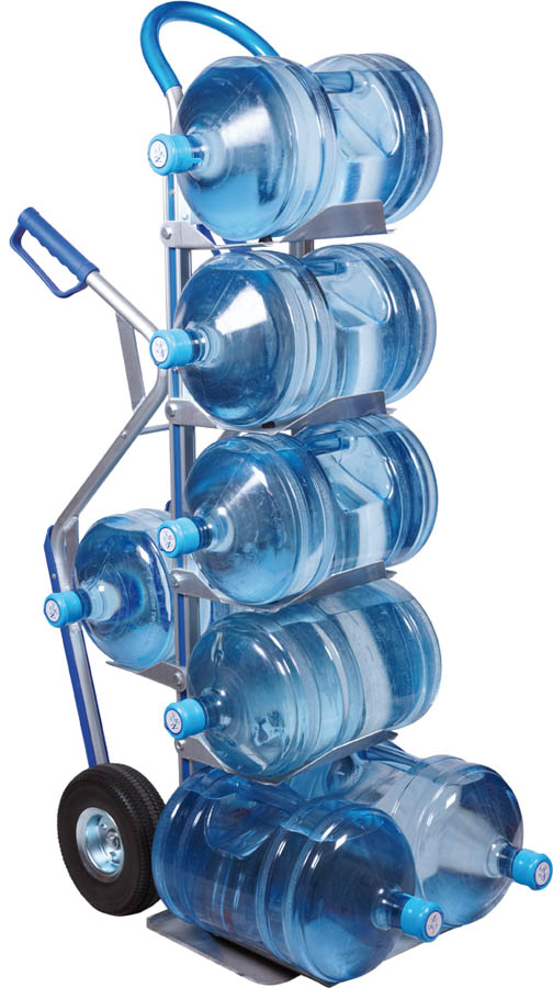 Carretilla de Aluminio de Hotel con plataforma abatible. Capacidad de carga máxima de 250Kg. Fabricada en tubo de aluminio soldado. Con empuñaduras ergonómicas de seguridad. Incorporan tiras centrales de refuerzo para una mayor resistencia y facilidad en la carga. Incorporan deslizadores para escaleras. Ruedas neumáticas con núcleo resistente metálico y rodamiento de bolas. Posibilidad de transportar hasta 5 bidones o garrafas.