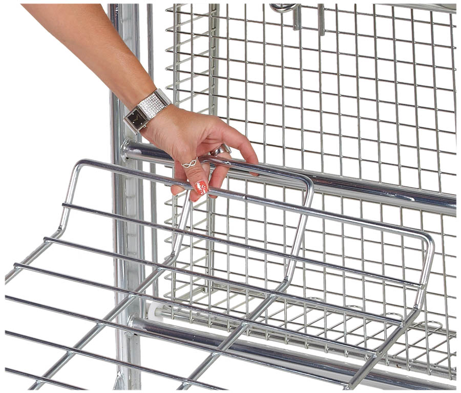 Carro encajable construido en acero galvanizado brillante. Con cuatro ruedas de poliuretano con diámetro de 125 mm. Plataforma sobre elevada para facilitar la carga y recogida de bultos. Incorpora una cesta adicional desplegable.