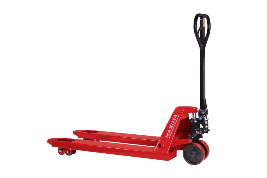 Transpaleta Manual con pala universal fabricada en acero pintado rojo. Ruedas de poliuretano. Válvula de seguridad por sobrecarga. Sistema de descenso cotrolado. 3 posiciones de control manual: descenso, neutral y elevación. Timón con protección ergonómica para un trabajo continuo. Lleva incorporados unos rodillos para una mejor entrada y salida transversal de la transpaleta.